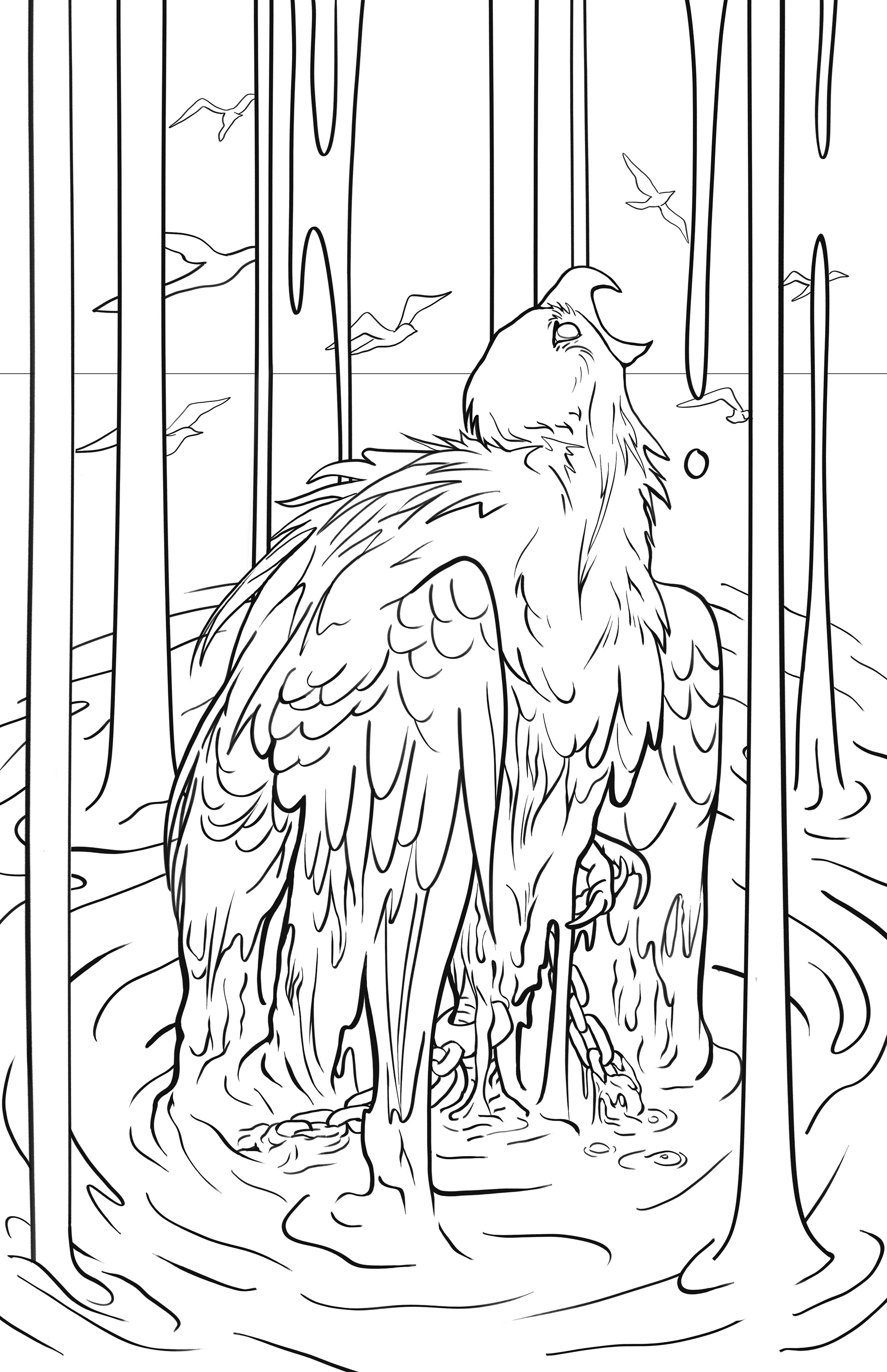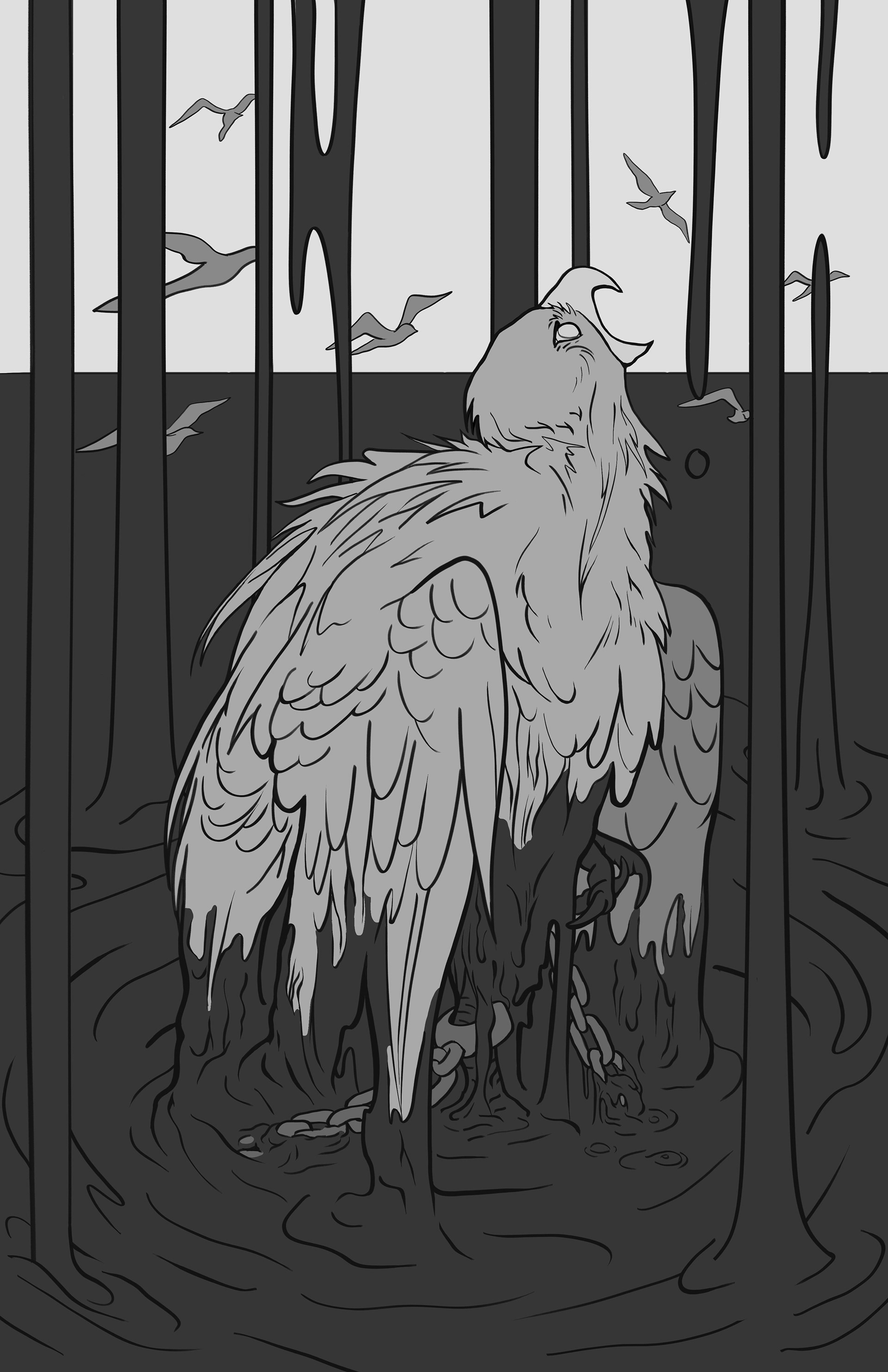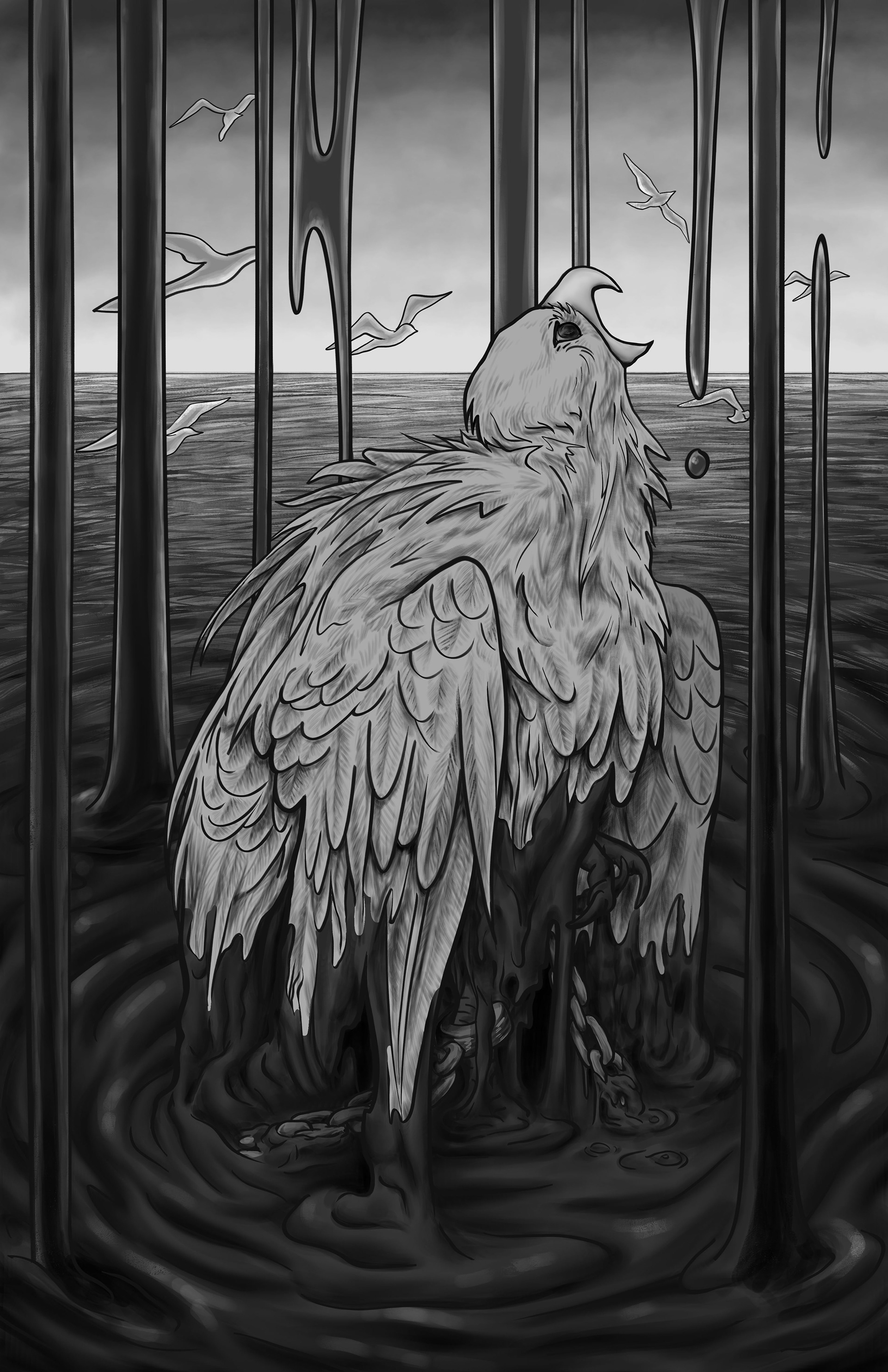 Shackled down by the chains of society, this once free bird has had its voice drowned out by the thick, suffocating oil... the oil representing strife and opposition.