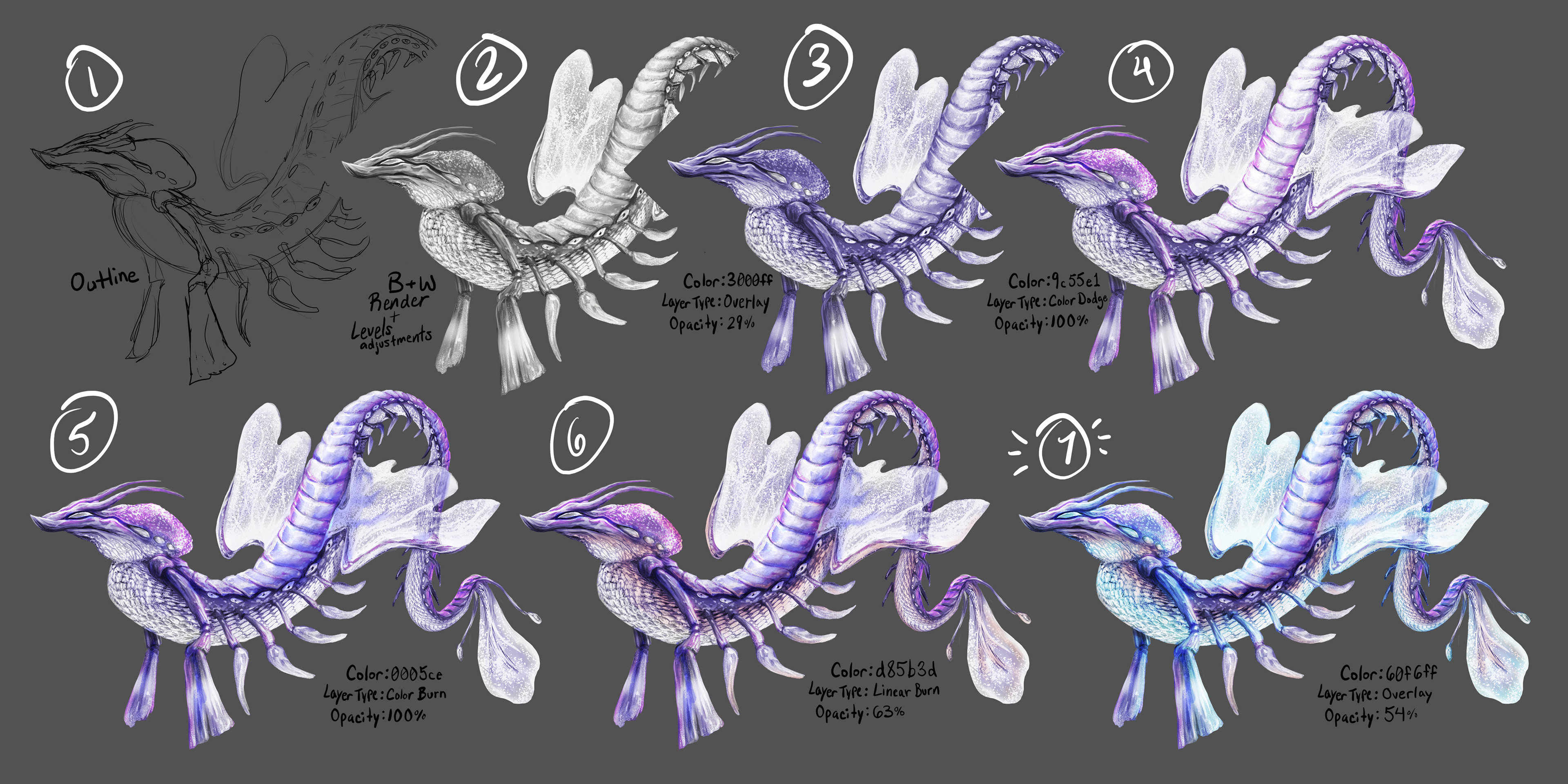 My coloring process in Photoshop using Solid Color Adjustment Layers as clipping masks